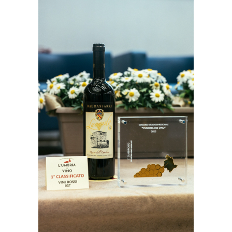 In diesem Jahr hat sich die Weinkellerei Baldassarri zum ersten Mal mit nicht weniger als zwei Etiketten, die mit zwei Gläsern ausgezeichnet wurden, in den renommierten Gambero Rosso Führer eingetragen. Das erste ist der IGT Umbrien Lucardo. Ein Verschnitt aus verschiedenen Rebsorten des Gebiets. In erster Linie natürlich Sagrantino, mit einer Beimischung von internationalen Rebsorten, nämlich Merlot und Cabernet. Es handelt sich um einen Wein, der 18 Monate lang in Holzfässern ausgebaut wird. Wir haben uns für ein grösseres Barrique als üblich entschieden, einen 300-Liter-Behälter. Warum haben wir ein grösseres Fass gewählt? Weil es eine geringere Oberfläche hat als das Volumen, so dass es dazu dient, eine nicht so aufdringliche, nicht so übermässige Holznote zu erzeugen. Ausserdem haben wir ein Novum gewählt, nämlich eine 40-monatige Reifung des Holzes. Dies führt zu einem weicheren, süsseren und weniger rauen Tannin. Warum haben wir eine Mischung aus diesen drei Rebsorten gemacht und warum hat sie dem Gambero Rosso so gut gefallen? Der Sagrantino ist eine Rebsorte, die wir kennen, eine Rebsorte, die der Rebe und dem Verschnitt ein gutes Alterungsverhalten und ein sehr grosses Entwicklungspotenzial verleiht. Der Merlot hingegen ist eine Sorte, die ihm eine sehr deutliche, sehr ausgeprägte rote Frucht verleiht. Wir lagern unsere Merlots viel länger als üblich, was ihm ebenfalls eine sehr reife Fruchtnote verleiht. Der Cabernet hingegen verleiht ihm eine eher pflanzliche, mentholhaltige, balsamische Note, die in der endgültigen Mischung sehr interessant ist. Das Holz, wie wir direkt aus dem Glas entnehmen können, verleiht ihm offensichtlich eine einzigartige Komplexität, die sich in Düften niederschlägt, die offensichtlich an aromatische Verbindungen erinnern. Also Tabak, Schokolade, Kaffee, geröstet. Ein ganzes würziges Universum, das von Pfeffer über Zimt und Nelken bis hin zu Lakritze reicht. Für uns in der Weinkellerei Baldassarri ist er also ein kompletter Wein. Er ist der wichtigste und prestigeträchtigste Rotwein, und wir sind sehr glücklich darüber, dass die Journalisten, Sommeliers und diejenigen, die ihn im Gambero Rosso verkostet haben, ihn geschätzt haben, worüber wir uns sehr freuen!