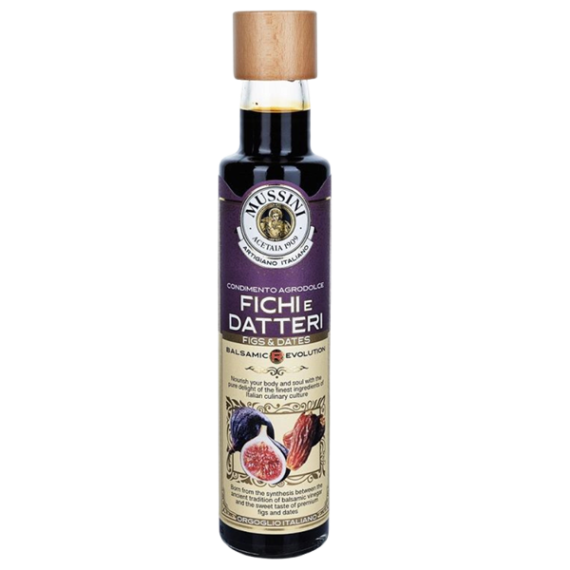 Der "Condimento Revolution Datteln und Feigen" von Acetaia Mussini aus der Emilia-Romagna ist, wie die anderen "Revolution"-Condimenti, eine innovative Essigspezialität, die die klassischen Balsamico-Noten mit den süssen und aromatischen Qualitäten von Datteln und Feigen verbindet.