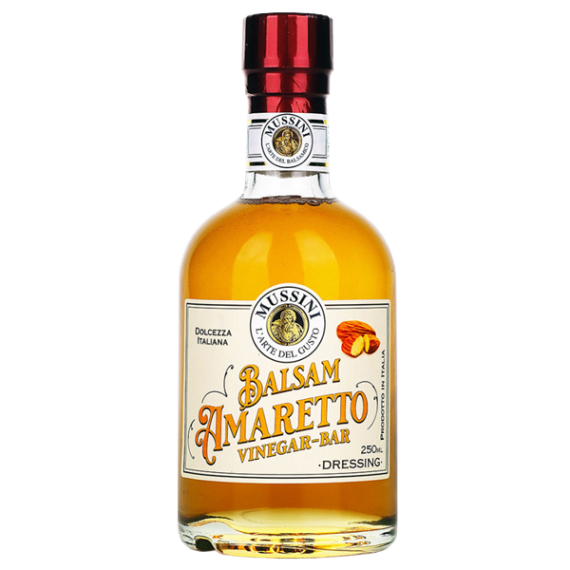 Ein Balsamico-Würzmittel aus gekochtem weissen Traubenmost und Weinessig, aromatisiert mit Amaretto und Mandeln. Dieses Produkt mit seiner intensiven Bernsteinfarbe und dem süssen Mandelgeschmack eignet sich hervorragend für die Zubereitung von alkoholischen und alkoholfreien Cocktails sowie zum Würzen von besonders schmackhaften Gerichten wie Obstsalat oder gemischtem Karotten-, Rüben- und Kartoffelpüree.