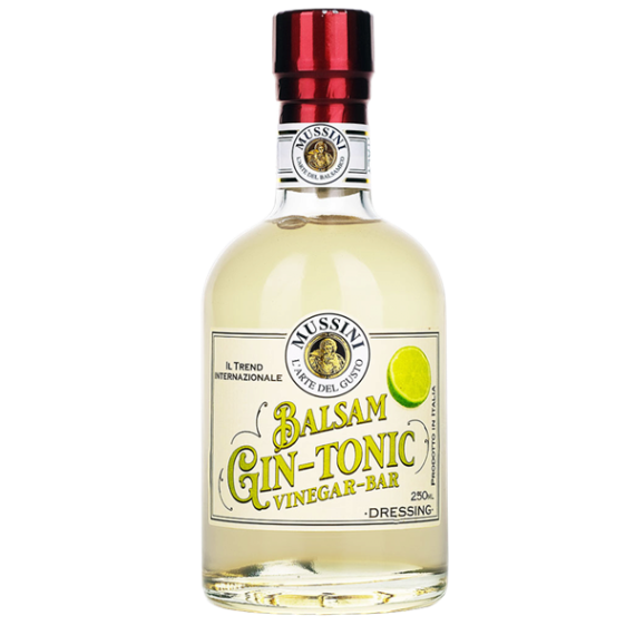 Ein balsamisches Würzmittel aus gekochtem weissen Traubenmost und Weinessig, aromatisiert mit Gin-Tonic und Limette. Dieses Produkt hat eine transparente Farbe und eine elegante Mischung der verschiedenen Geschmacksrichtungen mit einem frischen Nachgeschmack. Es eignet sich hervorragend für die Zubereitung von Cocktails, sowohl alkoholisch als auch alkoholfrei, aber auch zum Würzen von besonders schmackhaften Gerichten wie Thunfischtartar oder Schweinefiletspiesschen.