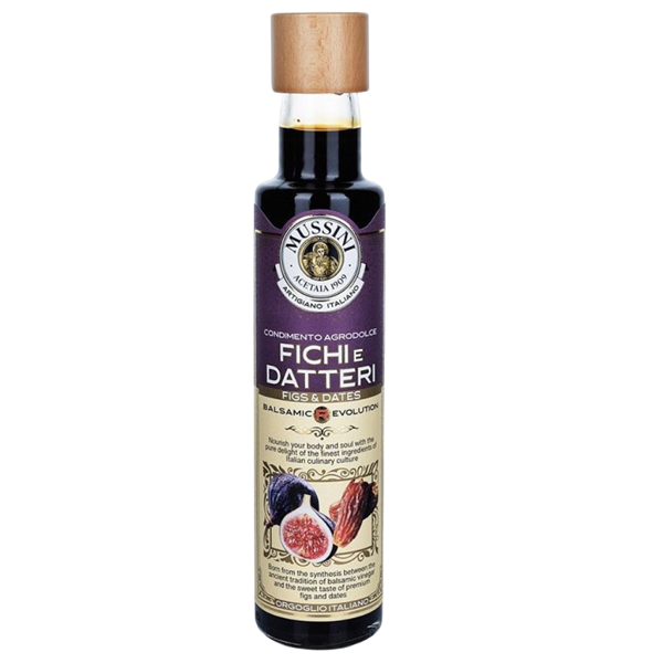 Der "Condimento Revolution Datteln und Feigen" von Acetaia Mussini aus der Emilia-Romagna ist, wie die anderen "Revolution"-Condimenti, eine innovative Essigspezialität, die die klassischen Balsamico-Noten mit den süssen und aromatischen Qualitäten von Datteln und Feigen verbindet.