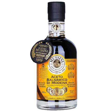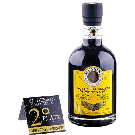 Der Balsamico-Essig aus Modena IGP von MUSSINI in einer Flasche von entwaffnender Eleganz - 5 Goldmedaillen - hat viele Kenner überzeugt, darunter auch die Jury einer der bekanntesten Wein- und Gastronomiezeitschriften Europas: „Der Feinschmecker“. Nach einer Auswahl von 50 Spitzenprodukten der besten Erzeuger unserer Region belegte dieses Produkt den zweiten Platz in der Gesamtwertung. Er hat eine sirupartige Konsistenz, eine dunkle, glänzende Farbe und einen angenehm süss-säuerlichen Geschmack. Ausgewogener Balsamico und gute Struktur, aromatisch mit einem Hauch von Pflaumen und Vanille.