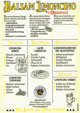 Degustationsnotiz: Klar und glänzend, sonnengelb, frische Zitronen. LIMONCINO in Balsamico-Version OHNE Alkohol.