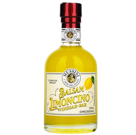 Balsamico Dressing aus weissem, gekochtem Traubenmost und Weinessig, aromatisiert mit Zitronenschalen und Limoncino. Mit seiner sattgelben Farbe und seinem intensiven Nachgeschmack nach Zitronen erweitert Mussini die wachsende Nachfrage nach alkoholfreien Getränken und schenkt so die Möglichkeit, neuartige Cocktails zu kreieren, aber auch verschiedene Gerichte zu verfeinern, besonders Fisch, wie zum Beispiel Lachs-Carpaccio.