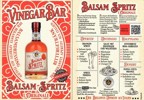 | Degustationsnotiz: Klare und leuchtend orange Farbe. Geruch nach Bitterorange. Spritzer in einer alkoholfreien Balsamico-Version. |